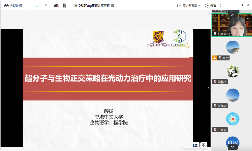 12月21日上午,我院教师发展中心邀请香港中文大学薛杨教授,作题为“超分子与生物正交策略在光动力治疗中的应用研究”的学术报告,学院师生线上参加报告会。报告由医学影像学院教师发展中心执行主任杨彩霞主持。
